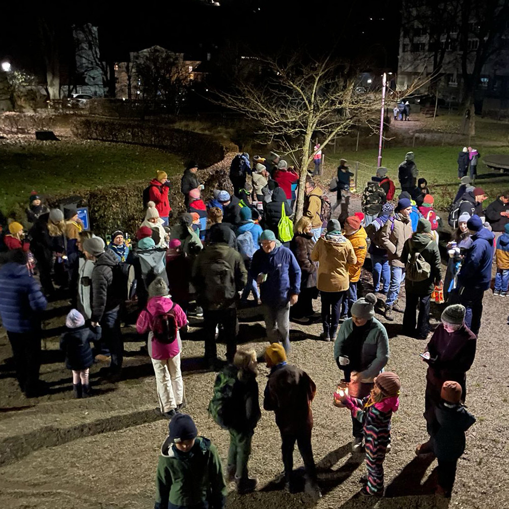 Nach dem Krippenspiel der Wichtel & Wölflinge (WiWö) sowie Glöckchen-Liedern der Caravelles & Explorer (CaEx) ging es mit einem Fackelzug zurück zum Schillerpark, wo bereits Punsch und Kekse warteten.